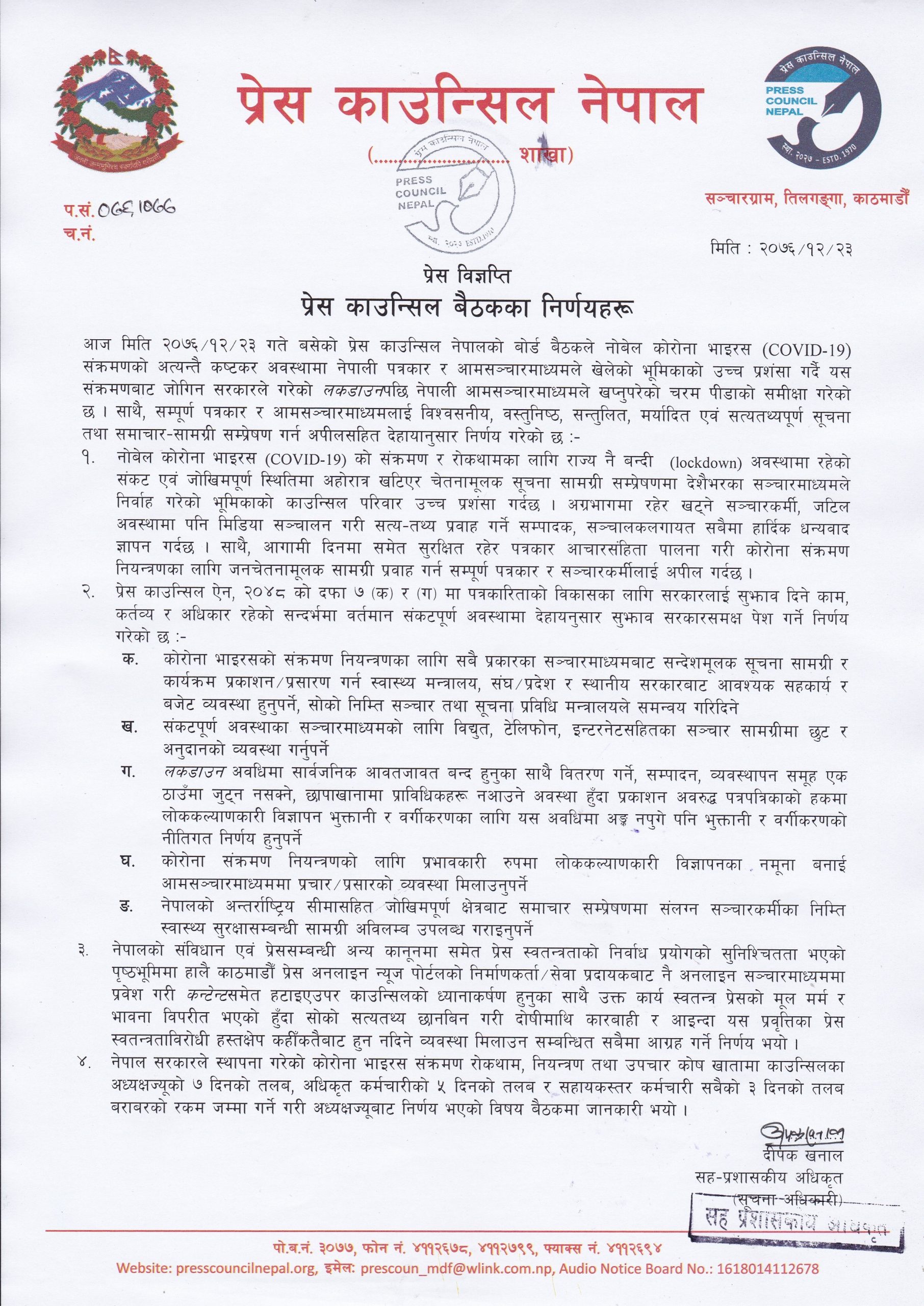 कोभिड–१९ को जोखिमबाट सुरक्षित रही विश्वसनीय, सन्तुलित र सत्यतथ्यपूर्ण सूचना एवं समाचार–सामग्री सम्प्रेषण गर्न आमसञ्चारमाध्यमलाई अपिल पनि गरेको छ । सार्वजनिक आवतजावत बन्द हुनाका साथै वितरण गर्ने, सम्पादन, व्यवस्थापन समूह एक ठाउँमा जुट्न नसक्ने, छापाखानामा प्राविधिकहरू नआउने अवस्था हुँदा प्रकाशन अवरुद्ध पत्रपत्रिकाको हकमा लोककल्याणकारी विज्ञापन भुक्तानी र वर्गीकरणका लागि यस अवधिमा अङ्क नपुगे पनि भुक्तानी र वर्गीकरणको नीतिगत निर्णय गर्न पनि सरकारसँग आग्रह गरेको छ ।