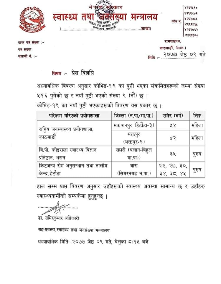 यस्तै सप्तरीमा १ जना, मकवानपुरमा १ जना र भक्तपुरमा १ जनामा कोरोना पुष्टि भएको छ । योसँग नेपालमा कुल संक्रमितको संख्या ५१६ पुगेको छ ।