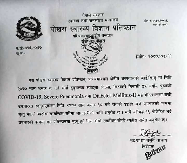 पोखरा स्वास्थ्य विज्ञान प्रतिष्ठान, पश्चिमाञ्चल क्षेत्रीय अस्पतालको आईसीयूमा उपचारत ५५ स्याङ्जाका ५५ वर्षीय पुरुषको उपचारको क्रममा बुधबार राति मृत्यु भएको हो ।