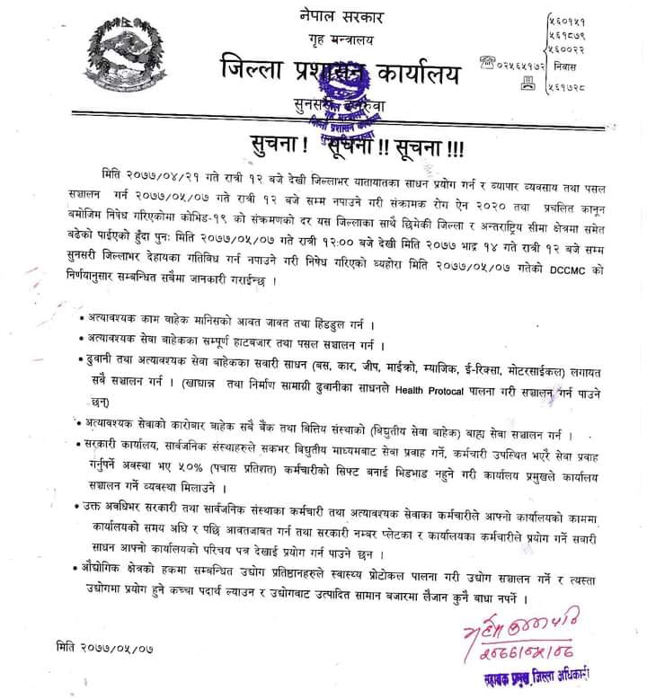 केही अत्यावश्यक सेवाका कार्यालयहरूमा स्वास्थ्य मन्त्रालयले तोकेको प्रोटोकल पालना हुनेगरी थोरै कर्मचारी राखेर काम गर्न गराउन प्रशासनले निर्देशन दिएको छ। सुनसरीमा तीन जनाको कोरोना संक्रमणबाट मृत्यु भएको छ भने ४३३ जनामा कोरोना देखिएको छ ।