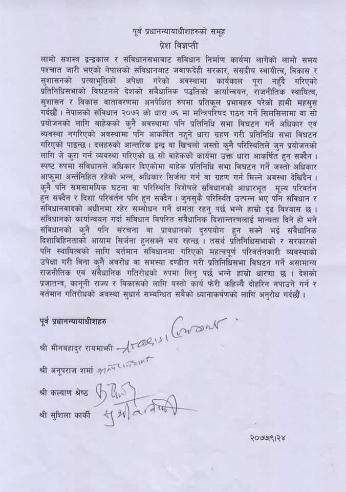 पूर्वप्रधानन्यायाधीशहरु मीनबहादुर रायमाझी, अनूपराज शर्मा, कल्याण श्रेष्ठ र सुशीला कार्कीले शुक्रबार संयुक्त वव्यक्त जारी गर्दै आकर्षित नहुने धारणा प्रयोग गरेर संसद भंग गरिएको बताएका हुन् ।