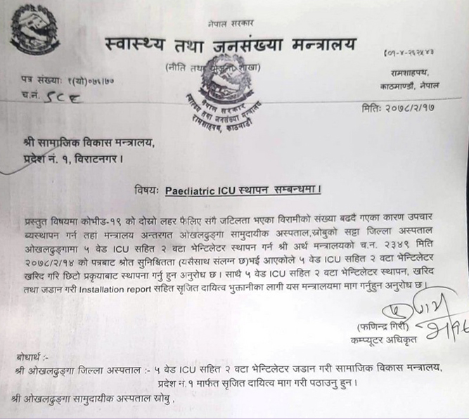 ओखलढुंगा सामुदायिक अस्पतालमा ५ बेड आइसियुसहित २ भेन्टिलेटर खरिद गरि जडान गर्न स्वास्थ्य तथा जनसंख्या मन्त्रालयले जेठ १६ गते पठाएको परिपत्र एक दिन नवित्दै परिवर्तन गरिउको छ । पत्रअनुसार उपकरण खरिदका लागि थप प्रक्रिया अगाडि बढाउन लाग्दा सोमबार निर्णय परिवर्तन भई अर्को परिपत्र मन्त्रालयले गरेको हो ।
