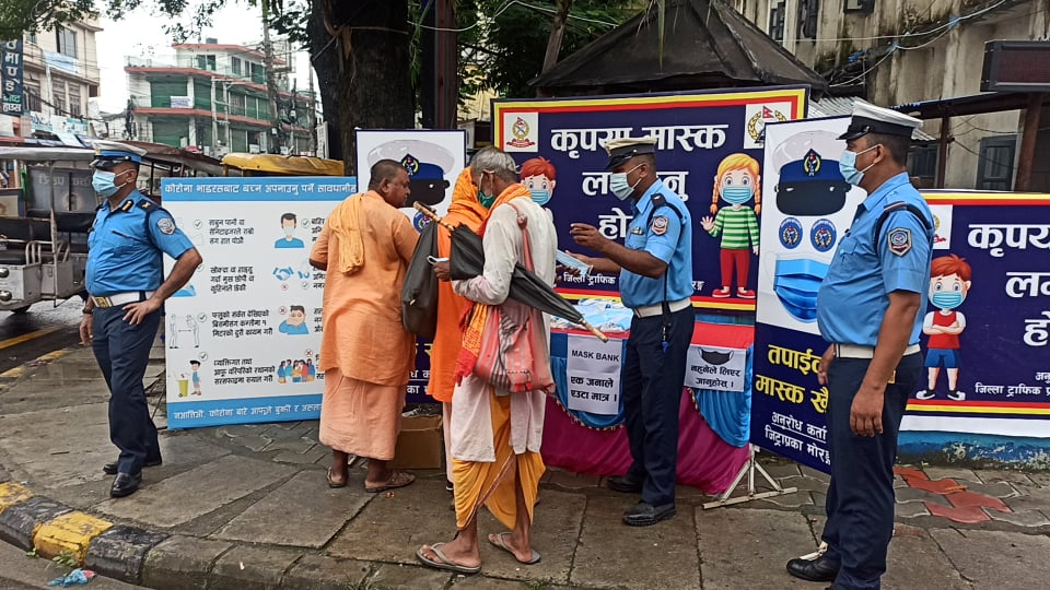 मंगलबारदेखि ‘मास्क बैंक’ स्थापना गरि सचेतना अभियान सुरू गरेको मोरङका ट्राफिक प्रमुख ट्राफिक प्रहरी निरीक्षक चन्द्र खड्काले जानकारी दिए । कोरोना भाइरसको जोखिम बढ्दै गएपछि थप संक्रमण फैलिन नदिन प्रहरीले यस्तो अभियान सञ्चालन गरेको हो । महामारीको रूपमा फैलिएको कोरोना भाइरस नियन्त्रण बाहिर जान थालेको र पछिल्लो समय मास्क पनि नलगाइ हिडडुल गर्न थालेपछि सचेतना अभियानसँगै विराटनगरको ट्राफिक चौकमा ‘मास्क बैंक’ स्थापना गरि अनिवार्य मास्क लगाउने अभियान सुरू गरेको ट्राफिक प्रहरी निरीक्षक खड्काले बताए । ‘सडकमा हिँड्नेदेखि सवारी साधानमा चढेनेसम्मलाई अनिवार्य मास्क गरेका छौं,’ उनले भने, ‘त्यसको लागि हामीले मास्क बैंक स्थापना गरेका छौं । पहिलो चरणमा मास्क अनिवार्य लगाउन सचेतना जागरुक गराउनेछौं ।’