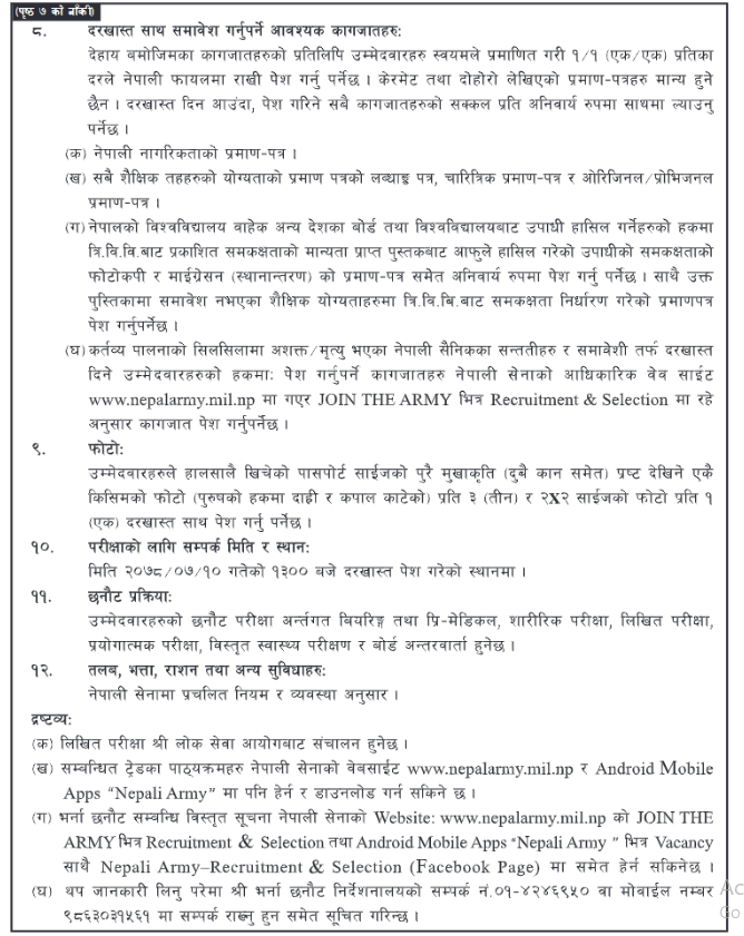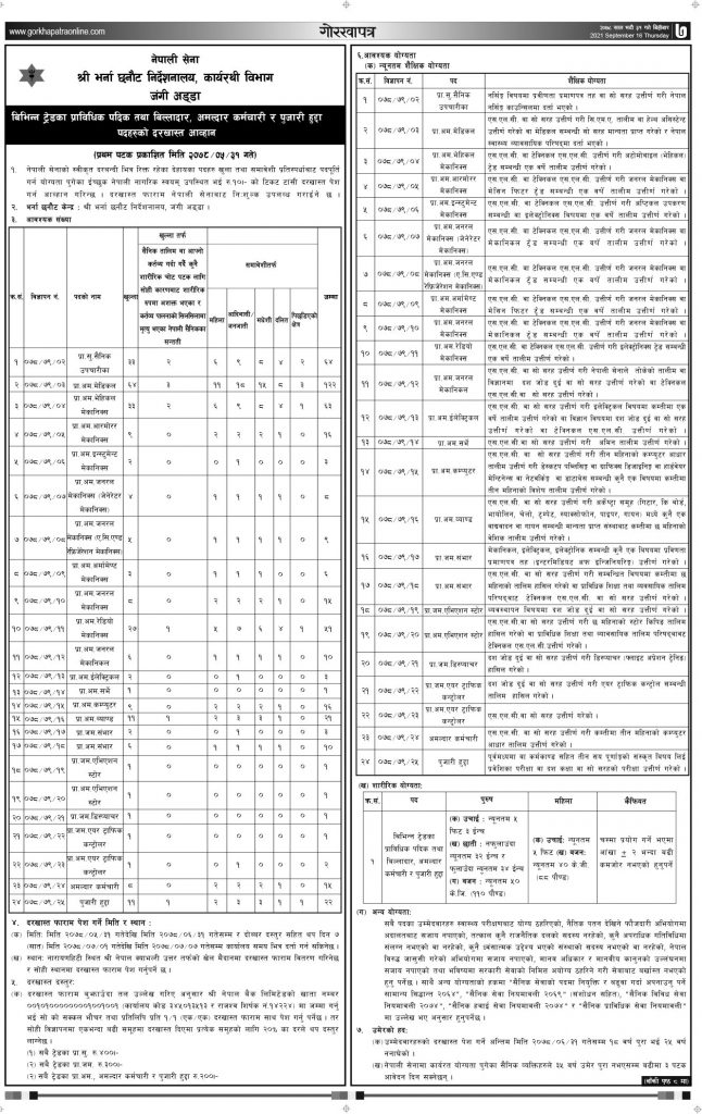 खुला तथा समावेशी प्रतिस्पर्धाबाट पदपूर्ति गर्न योग्यता पुगेकाहरूबाट सेनाले दरखास्त आह्वान गरेको छ। सूचनामा सैनिक तालिम वा आफ्नो कर्तव्य गर्दा गर्दै कुनै शारीरिक चोटपटक लागेर सोही कारणबाट शारीरिक रूपमा अशक्त भएका र कर्तव्य पालनाको सिलसिलामा मृत्यु भएका नेपाली सैनिकका सन्ततीलाई पनि सेनाले खुलातर्फ बेग्लै आरक्षण सिटको व्यवस्थासहित दरखास्त आह्वान गरेको छ।