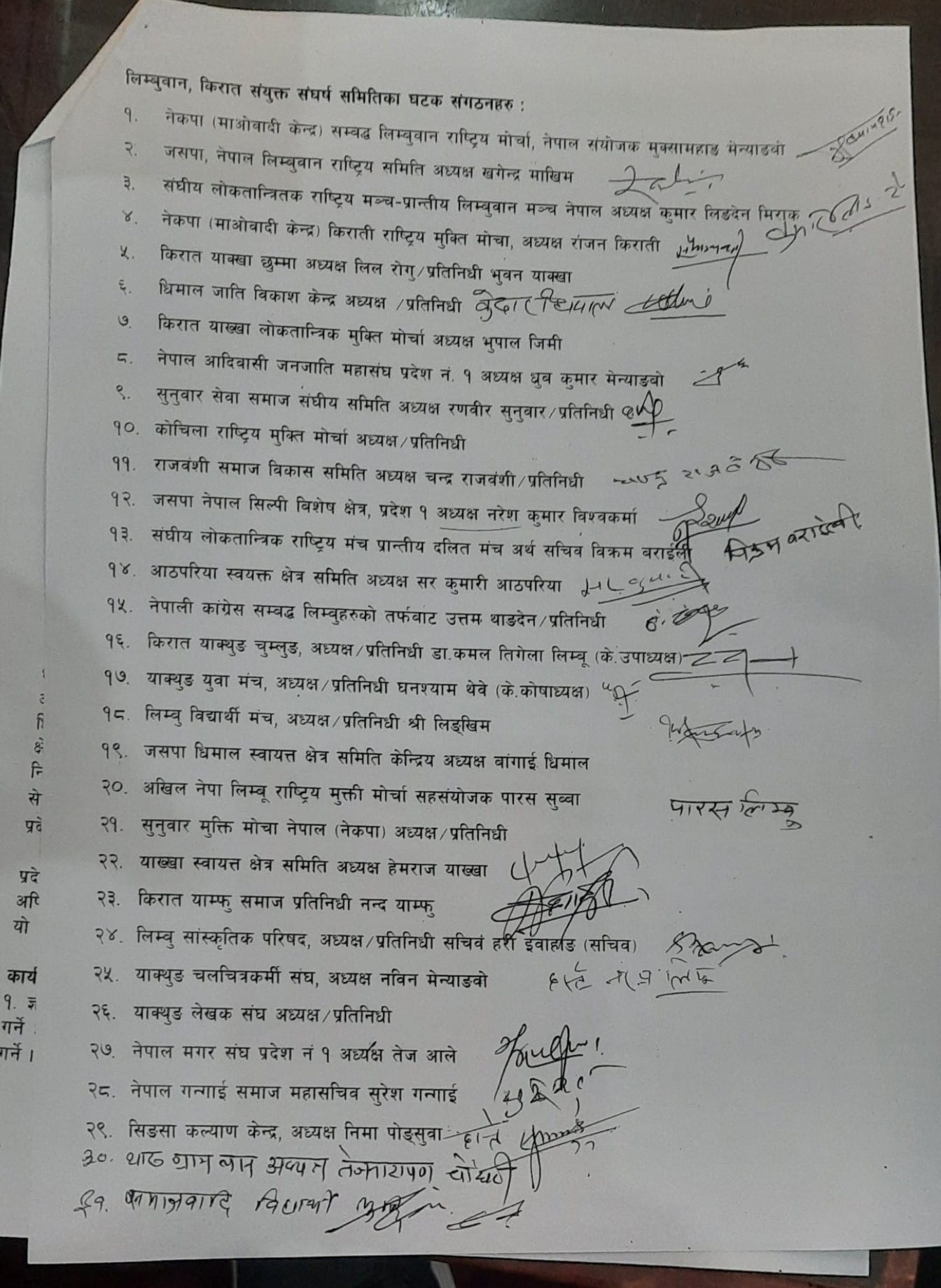 लिम्बुवान किरात संयुक्त संघर्ष समितिका घटकहरुमा नेकपा माओवादी सम्बद्ध लिम्बुवान राष्ट्रिय मुक्ति मोर्चाका तर्फबाट मुक्साहाङ मेन्याङ्बो, जसपा, नेपाल लिम्बुवान राष्ट्रिय समितिका अध्यक्ष खगेन्द्र माखिम, संघीय लोकतान्त्रिक राष्ट्रिय मञ्च– प्रान्तीय लिम्बुवान मञ्च नेपालका अध्यक्ष कुमार लिङ्देन मिराक, माओवादी केन्द्र निकट किराँत राष्ट्रिय मुक्ति मोर्चाका अध्यक्ष राजन किराँती, किरात याक्खा छुम्माका अध्यक्ष लिल रोग, धिमाल जाति विकास केन्द्रका केदार धिमाल, आदिवासी जनजाति महासंघ प्रदेश १ का अध्यक्ष ध्रुबकुमार मेन्याङ्बोलगायत सहभागी छन् ।