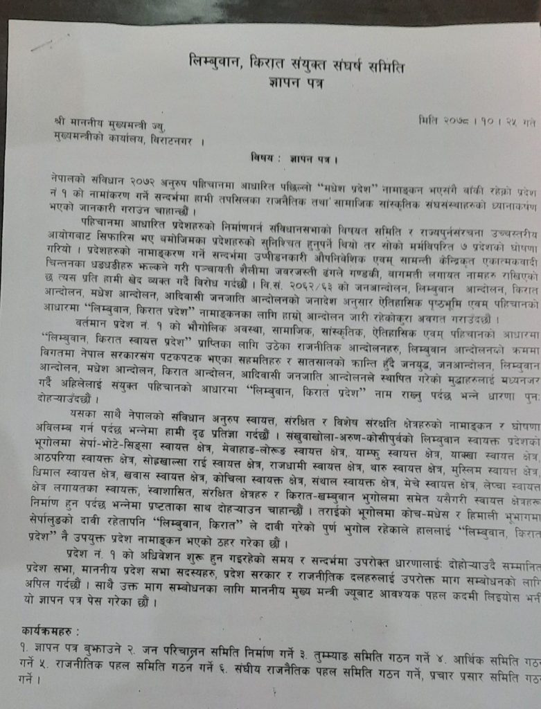 विराटनगरस्थित मुख्यमन्त्रीको कार्यालयमा विभिन्न पहिचानवादी ३१ संघ संगठनका प्रतिनिधिहरु उपस्थित भएर मुख्यमन्त्री राईलाई ज्ञापन पत्र बुझाएका हुन् । उनीहरुले प्रदेश १ को भौगोलिक अवस्था, सामाजिक, सांस्कृति, आन्दोलनहरु, लिम्बुवान आन्दोलनको क्रममा विगतमा नेपाल सरकारसँग पटकपटक भएका सहमतिहरु र सातसातको क्रान्ति हुँदै जनयुद्ध, जनआन्दोलन, लिम्बुवान आन्दोलन, मधेश आन्दोलन, किरात आन्दोलन, आदिवासी जनजाति आन्दोलनले स्थापित गरेका मुद्दाहरुलाई मध्यनजर गर्दै अहिलेलाई संयुक्त पहिचानको आधारमा ‘लिम्बुवान–किरात प्रदेश’ नाम राख्नु पर्ने माग गरेका हुन् ।