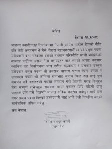 पोखरा । पोखरा महानगरपालिकाको मेयरमा उम्मेदवारी दिएका नेपाली कांग्रेसका नेता विमलबहादुर कार्कीले गठबन्धनको उम्मेदवारलाई समर्थन गर्दै उम्मेदवारी फिर्ता लिएका छन ।