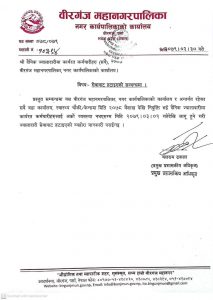 विराटनगर । वीरगञ्ज महानगरपालिकाले ज्यालादारी कर्मचारी हटाएको छ ।तत्कालिन मेयर विजय सरावगीले नियुक्त गरेका सबै ज्यालादारी कर्मचारी हटाएको हो