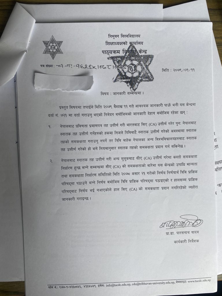 उनका अनुसार स्नातक पास भई सिए उत्तिर्ण गर्नेहरुको हकमा कस्तो समकक्षता हाँसिल हुन्छ भन्ने बिषयमा कुनै निर्णय भएको छैन । ‘नेपालबाट स्नातक तह उत्र्तिण गरी अन्य मुलुकबाट सिए उत्र्तीण गरेमा कस्तो समकक्षता निर्धारण हुन्छ भन्ने सम्बन्धमा सिएको समकक्षताको बारेमा यस केन्द्रको उपाधि मान्यता तथा समकक्षता निर्धारण समितिको मिति २०७८ असार २१ गतेको निर्णय निर्णायर्थ त्रिवि प्राज्ञिक परिषद्मा पठाउने भन्ने निर्णय बमोजिम त्रिवि प्राज्ञिक परिषद्मा पठाइएको र हालसम्म प्राज्ञिक परिषद्बाट निर्णय भई नआएकाले हाल स्नातकोत्तरको समकक्षता प्रदान नगरिरहेको व्यहोरा जानकारी गराइन्छ’ कार्यकारी निर्देशक यादवले पत्रमार्फत भनेका छन् ।