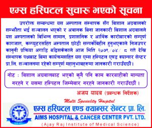 ‘यस अस्पताल संस्थापक सँग विशाल अग्रवालको सम्झौता भइ संचालन भएको र अचानक बिना जानकारी विशाल अग्रवालले यस अस्पतालको विभिन्न सामान, प्रशासनिक र आर्थिक कारोबारको सम्पूर्ण कागजात, कम्प्युटरसहित अस्पताल छोडी सम्र्पक विहीन हुनुभएकोले निज उपर कानुनी प्रक्रिया अगाडी बढीसकेकोले आज मिति २०७९÷०४÷ ८ गते देखी संस्थापक पक्षत्रबाट बिमा कार्यक्रमसहित यस एम्स हस्पिटल एण्ड क्यान्सर सेन्टर प्रा.लि. संचालनमा रहेको सम्पूर्ण महानुभावहरुमा जानकारी गराउँदछौं,’ हस्पिटलले जारी गरेको सूचनामा उल्लेखछ ।’