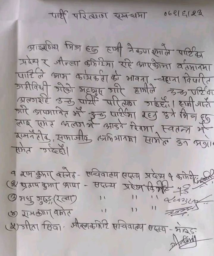 टिकट वितरणप्रति असन्तुष्ट रहेका प्रदेश कमिटि सचिबालय सदस्य तथा संगठन विभाग प्रमुख रामकुमार बस्नेतसहित चार प्रदेश कमिटि सदस्य तथा अर्का जिल्ला कमिटि सदस्यले पनि पार्टी छाडेका छन् । बस्नेतसहित प्रदेश कमिटि सदस्यहरु प्रतापकुमार थापा, मधु गुरुङ, राजकुमार बस्नेत र जिल्ला कमिटि सदस्य सचिबालय सदस्य गिता सिवाले पनि पार्टी परित्याग गरेका छन् ।