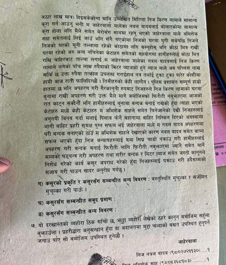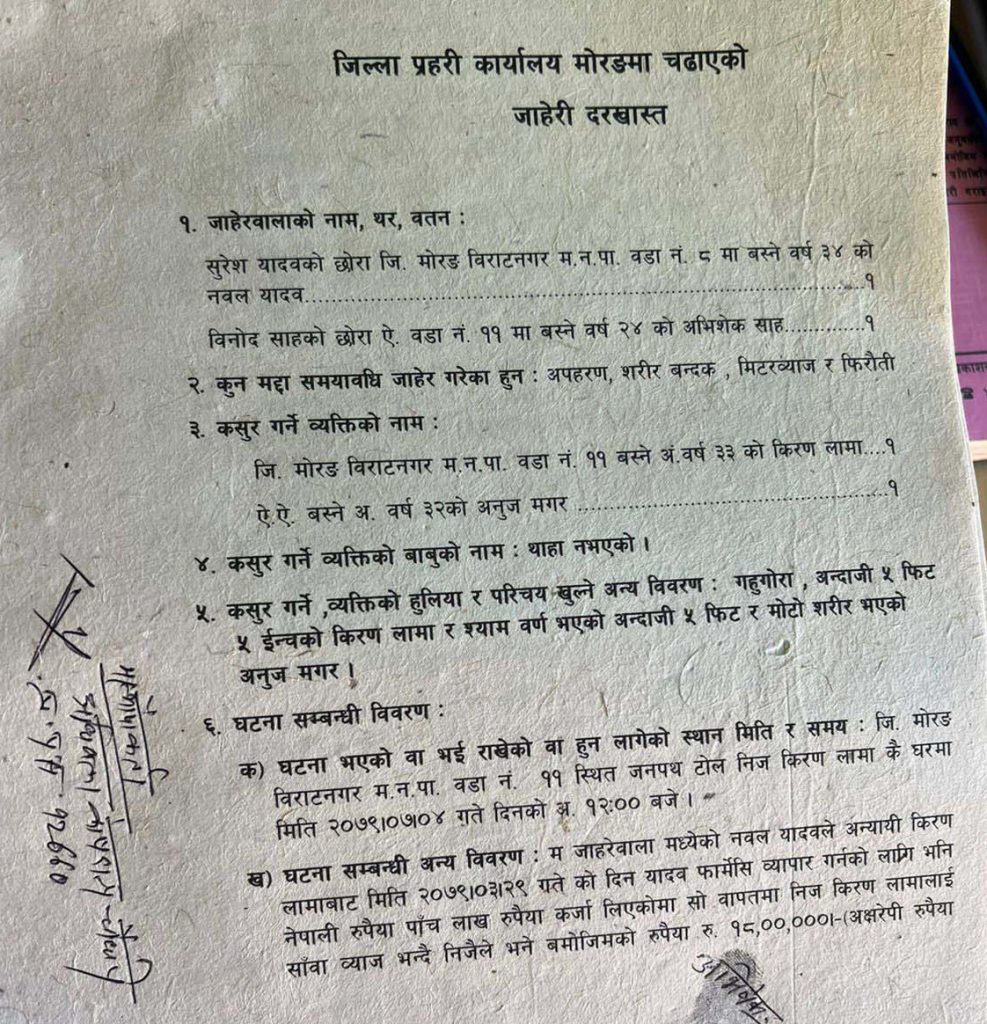 शुक्रवार नै पीडितले जिल्ला प्रहरी कार्यालय मोरङमा ठाडो निवेदन दिएका थिए । शनिवार उनीहरूले जाहेरी दरखास्त दिएका छन् ।