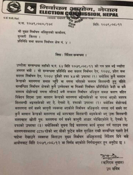 आयोगले सुनसरी ४ मा शिलबन्दी गरिएको बाहेक मात्रै पुनःमतगणना गर्न मुख्य निर्वाचन अधिकृतको कार्यालयलाई निर्देशन दिएको छ ।