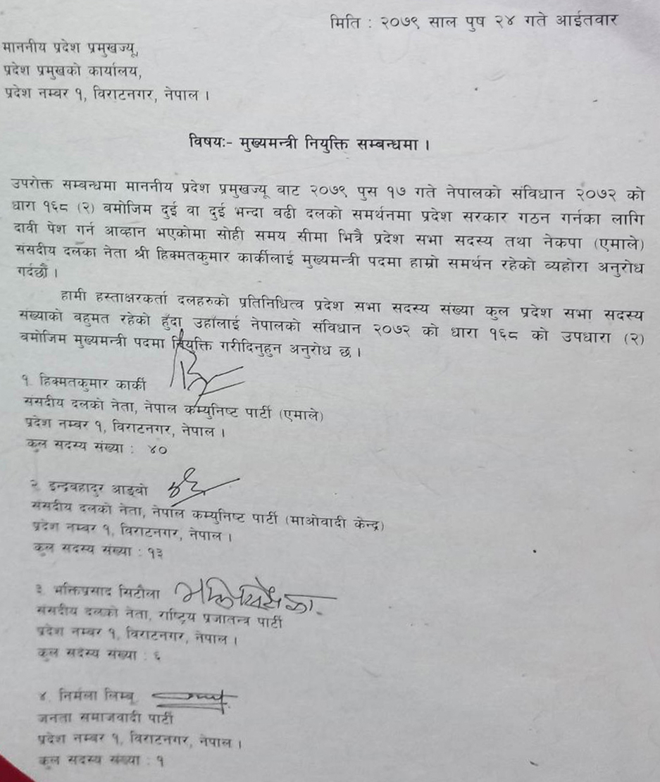विराटनगर । प्रदेशसभाका ६० जना सदस्यको हस्ताक्षरसहित नेकपा एमाले संसदीय दलका नेता हिक्मतकुमार कार्कीले प्रदेश १ को मुख्यमन्त्रीमा दाबी पेश गरेका छन् ।