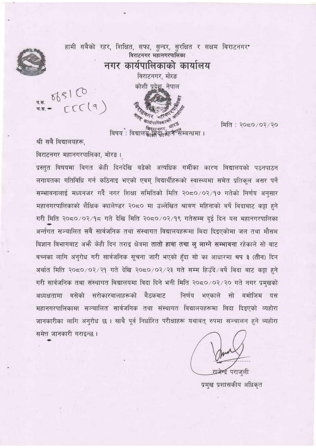 महानगरपालिकाले अत्याधिक गर्मीका कारण विद्यालयको पठनपाठन लगायतका गतिविधि गर्न कठिनाई भएको एवम् विद्यार्थीको स्वास्थ्यमा समेत प्रतिकूल असर पर्ने सम्भावनालाई मध्यनजर गर्दै १८ गते र १९ गतेसम्म दुई दिन विदा दिने निर्णय गरेको थियो ।