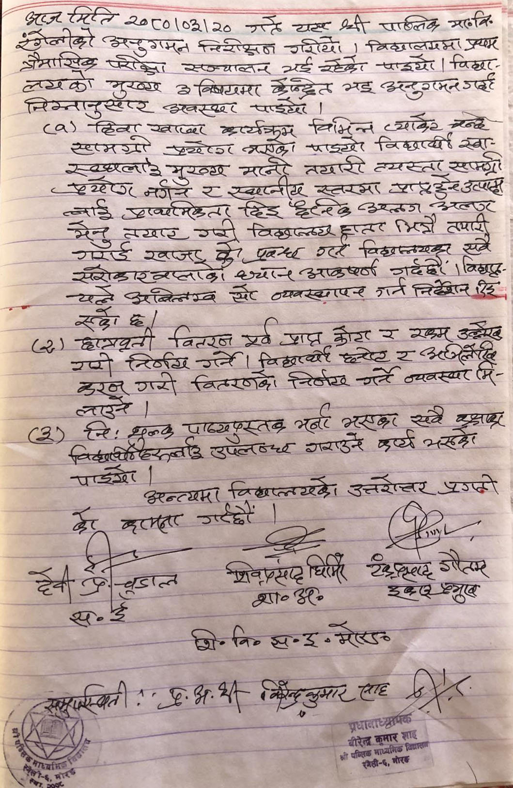 ‘दिवा खाजा कार्यक्रम विभिन्न प्याकेट बन्द सामाग्री प्रयोग भएको पाइयो । विद्यार्थी स्वास्थ्यलाई मुख्य मानी तयारी त्यस्ता सामग्री प्रयोग नगर्ने र स्थानीय स्तरमा प्राप्त हुने उत्पादनलाई प्राथमिकता दिई दैनिक अलगअलग मेनु तयार गरी विद्यालय हाताभित्रै तयारी गराई खाजाको प्रबन्ध गर्न विद्यालयको सबै सरोकारवालाको ध्यानाकर्षण गर्दछौं । विद्यालयले अविलम्ब सो व्यवस्थापन गर्न निर्देशन दिइएको छ,’ समितिले दिएको निर्देशनमा उल्लेख छ । विद्यालयका प्रधानाध्यापक यादवले आफूहरुले यसअघि नै खरिद गरिसकेको कारण उक्त प्याकेटहरु नसकिएसम्म त्यही प्रयोग गर्नुपर्ने बाध्यता रहेको बताएका छन् ।