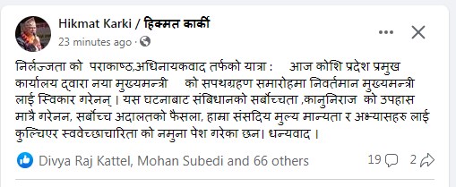 शपथग्रहण समारोहबाट बाहिरिएपछि कार्कीले सामाजिक सञ्जाल फेसबुकमा प्रदेश प्रमुखप्रति आक्रोश व्यक्त गरेका छन् । कोशी प्रदेशमा अधिनायकवादको अभ्यास भएको र निर्लज्जताको पराकाष्ठा भएको उनले लेखका छन् । प्रदेश प्रमुखले स्वेच्छाचारिता देखाएको उनको गुनासो छ ।
