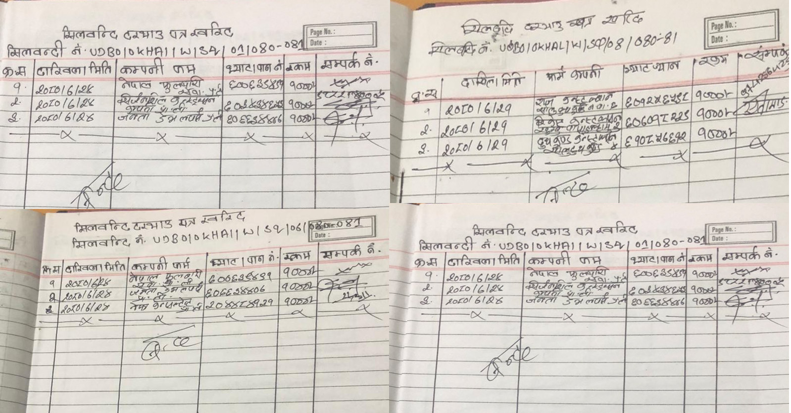 कार्यालयले कात्तिक १२ गते सुचना प्रकाशन गर्न दिएको स्थानीय पत्रिका बोलपत्र खरिद गर्ने अवधिसम्म बजारमा वितरण भएको थिएन । म्याद सकिएपछि सूचना सार्वजनिक भएको, ८ वटा ठेक्कामा प्रक्रिया पुर्याउन प्रतिठेक्का ३ वटाका दरले मात्र दरभाउपत्र दर्ता गरेर मिलेमतो गरिएको तथ्य भेटिएको छ । कार्यालयले ३ जना निर्माण व्यवसायीहरुले ल्याएका २४ वटा दरभाउपत्र मिलाएर दर्ता गरि मिलेमतो गरेको कार्यालयको दर्ता अभिलेख हेर्दा पुष्टि हुन्छ ।