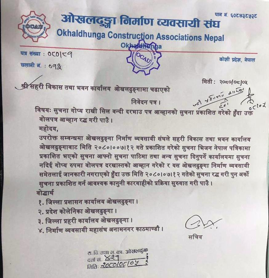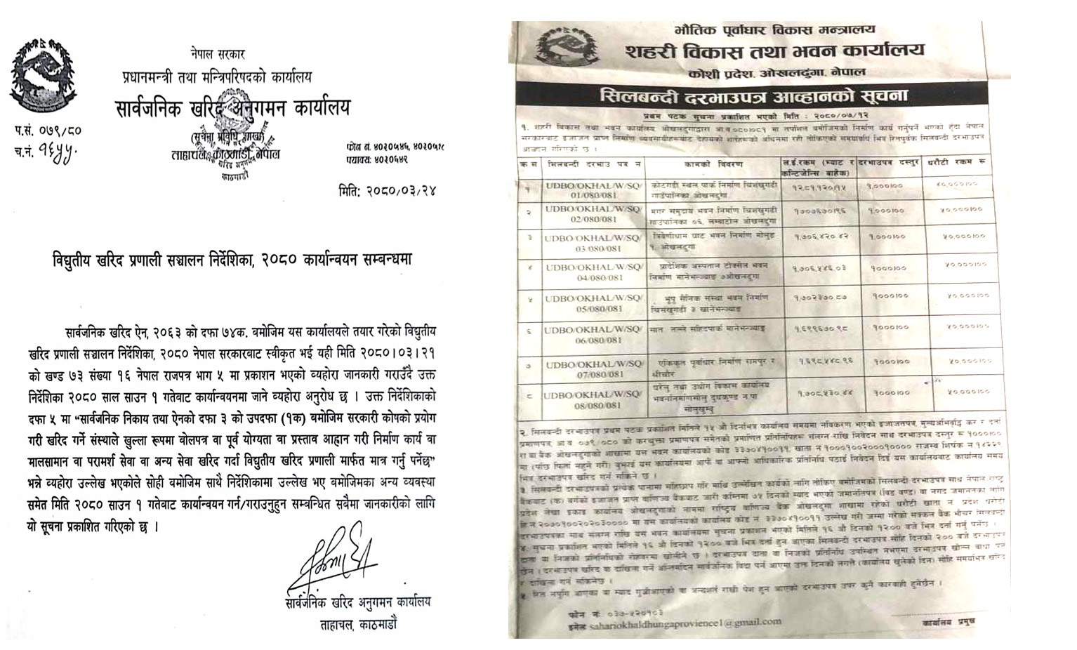 उक्त व्यवस्था कार्यन्वयन गर्न देशभरका सरकारी कार्यालयलाई २०८० असार २४ गते पत्रचार गर्दै निर्देशिका अनिवार्य कार्यान्वयन गर्न परिपत्रसमेत गरेको थियो । शहरी विकास तथा भवन कार्यालयका प्रमुख अनुज श्रेष्ठ र जिल्लाका केही निर्माण व्यवसायीको मिलेमतोमा स्थानीय पत्रिकामा सूचना दिएर पत्रिकासमेत बजारमा नल्याई मिलेमतोमा बोलपत्र दर्ता गरेको भन्दै निर्माण व्यवसायी संघ ओखलढुंगाले उजुरी गरेपछि यो तथ्य बाहिरिएको हो ।