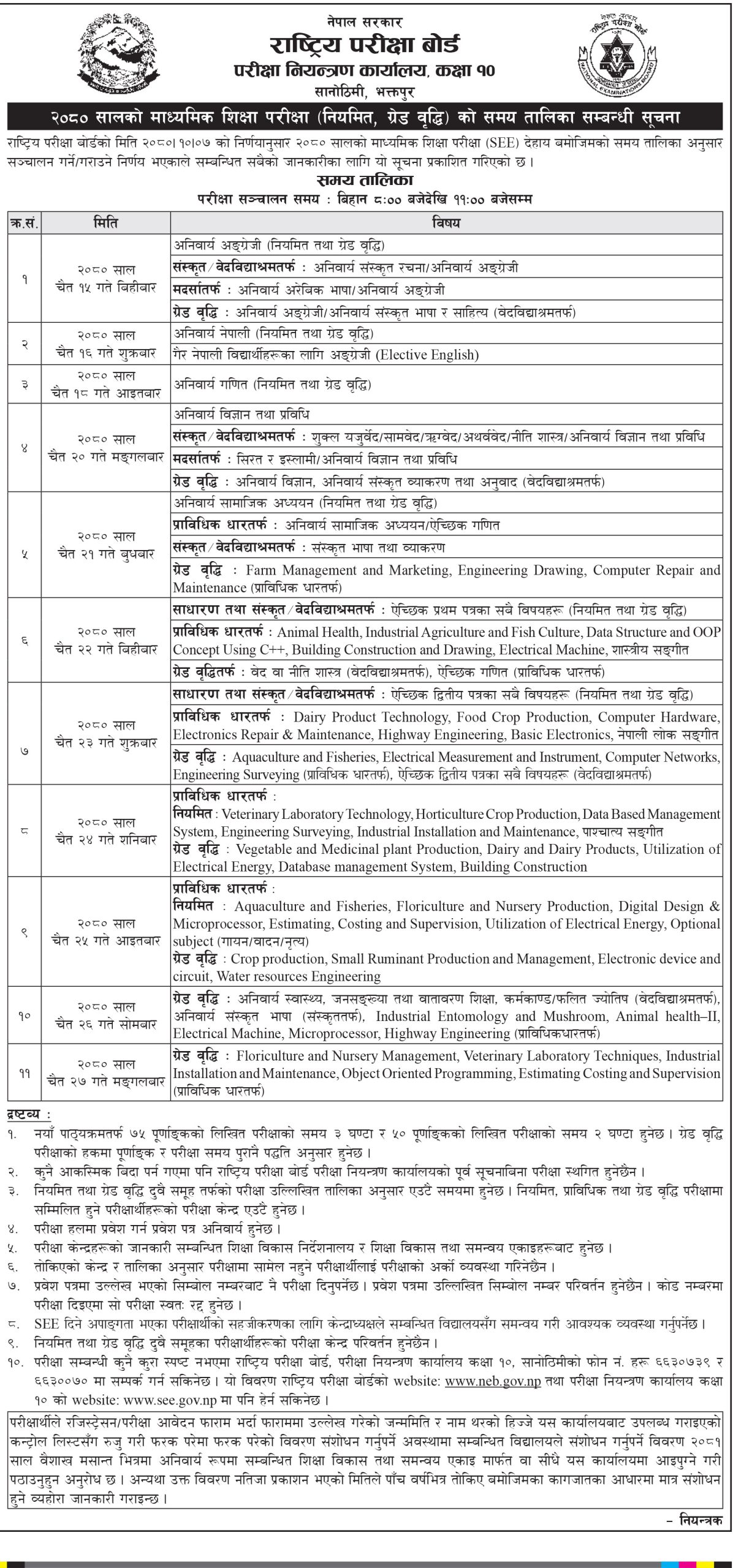 परीक्षा नियन्त्रण कार्यालयले एसईईको चैत १५ देखी परीक्षा हुने तालिका सार्वजनिक गरेको छ।