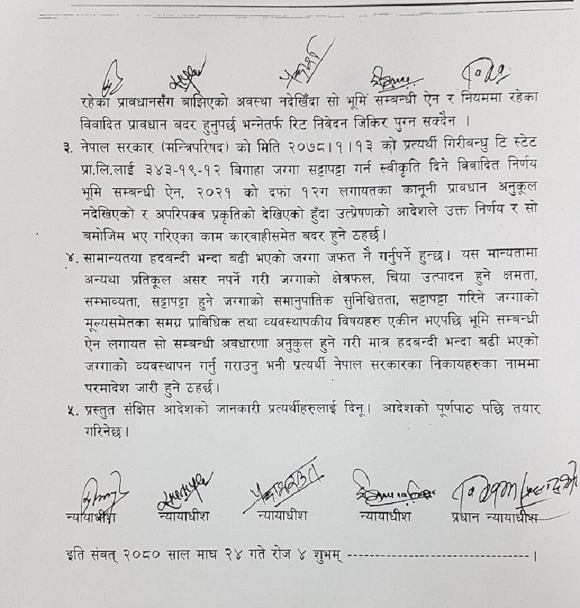 सर्वोच्चले विवादित निर्णय भूमिसम्बन्धी ऐन, २०२१ को दफा १२ (ग) लगायतका कानूनी प्रावधान अनुकुल नदेखिएको र अपरिपक्व प्रकृतिको देखिएकोले उत्प्रेषणको आदेशबाट बदर गरेको छ । सरकारको उक्त निर्णय र सो बमोजिम भए गरिएका काम कारवाही समेत बदर हुने ठहर सर्वोच्चले गरेको छ ।