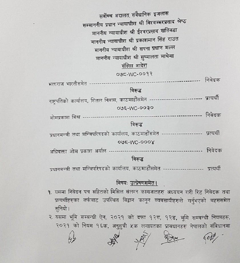 संवैधानिक इजलासमा प्रधानन्यायाधीश विश्वम्भर प्रसाद श्रेष्ठसहित न्यायाधीशहरू ईश्वरप्रसाद खतिवडा, प्रकाशमान सिंह राउत, सपना प्रधानमल्ल र सुष्मालता माथेमा रहेका थिए । अधिवक्ता ओमप्रकाश अर्याल, ओमप्रकाश मिश्र र भक्तराज भारतीसमेत भई दायर भएको दायर भएको रिक्त रिटलाई एकसाथ राखी सुनुवाइ भएको थियो । गत माघ ३ गतेदेखि हेर्दाहेर्दैमा राखी सुनुवाइ भइरहेको मुद्दाको अन्तिम फैसला आएको हो ।