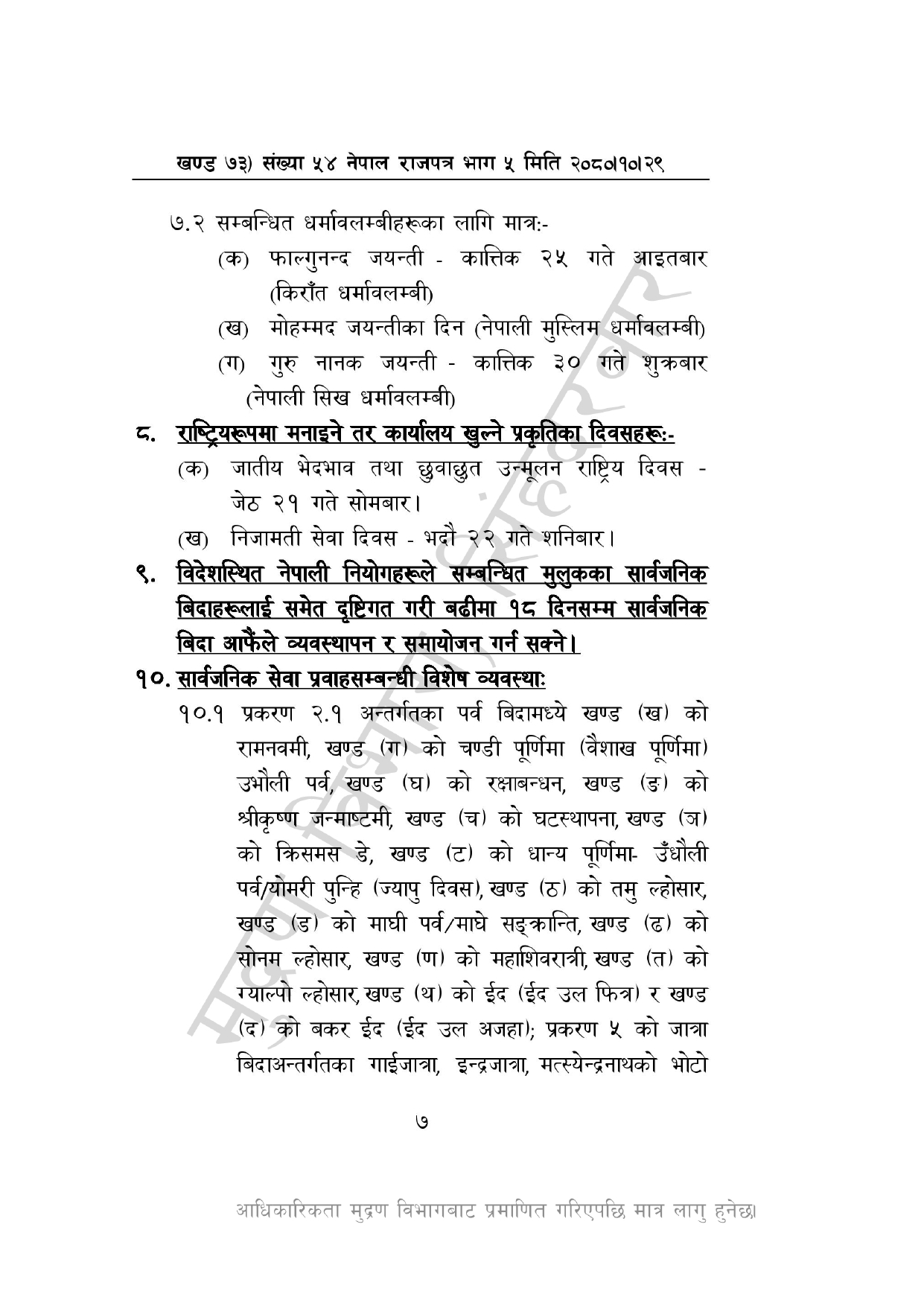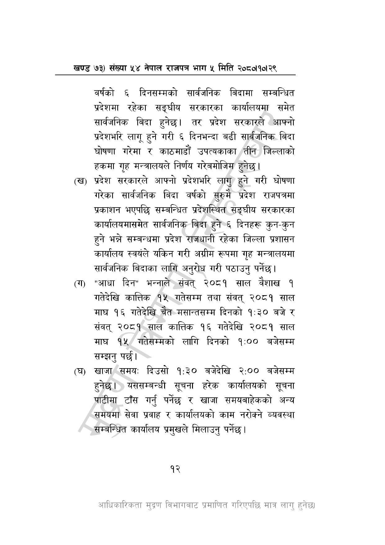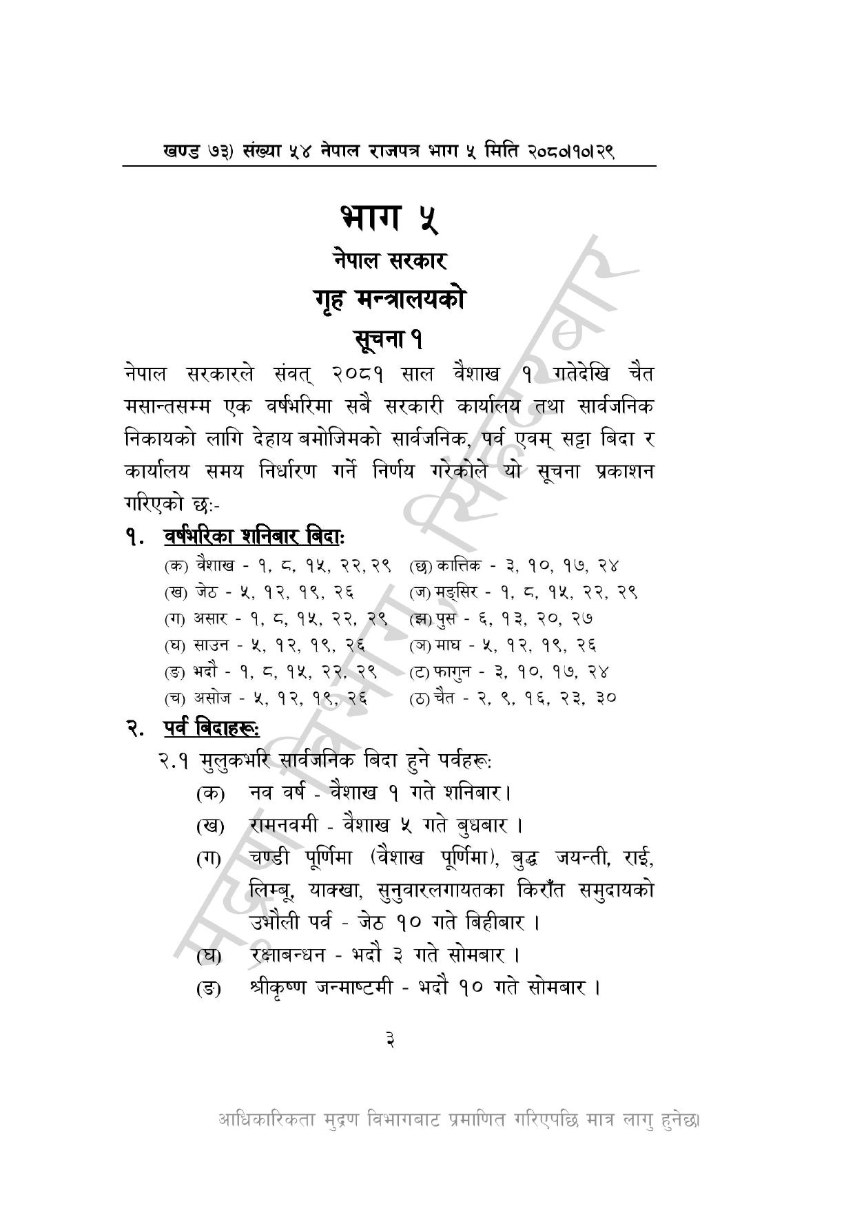 गृह मन्त्रालयले राजपत्रमा प्रकाशन गरेको सूचना अनुसार एक वर्षमा ५३ शनिबार विदा हुने छ भने पर्व, दिवस र उत्सव विदा ३५ दिन कायम गरिएको छ ।