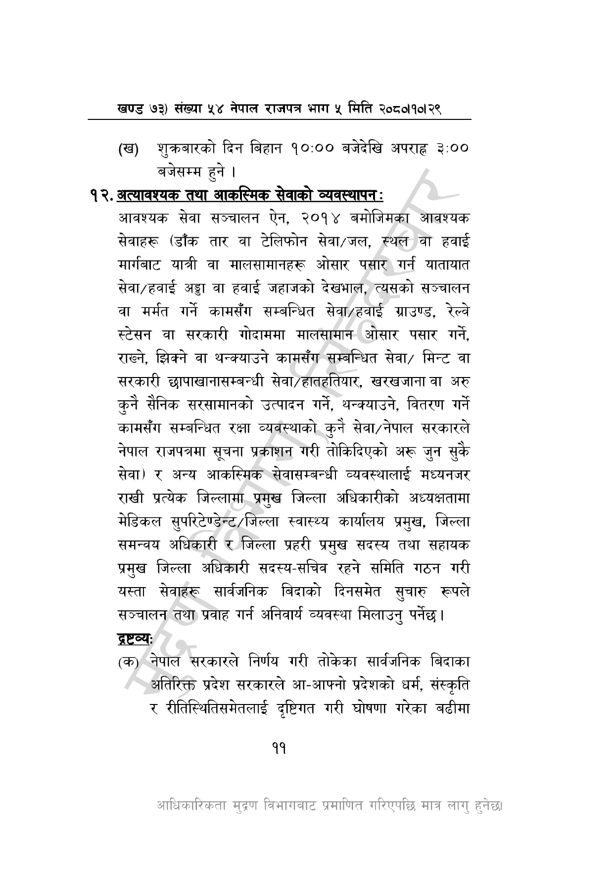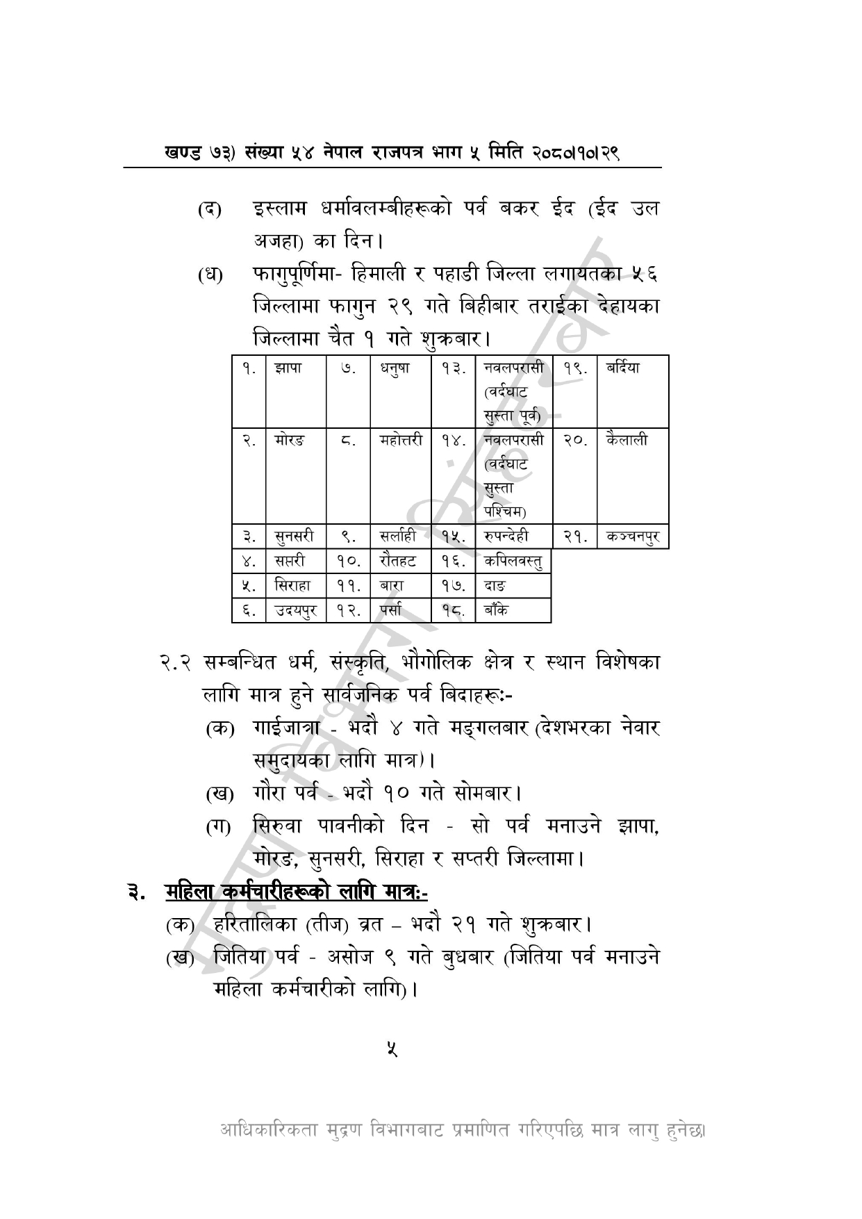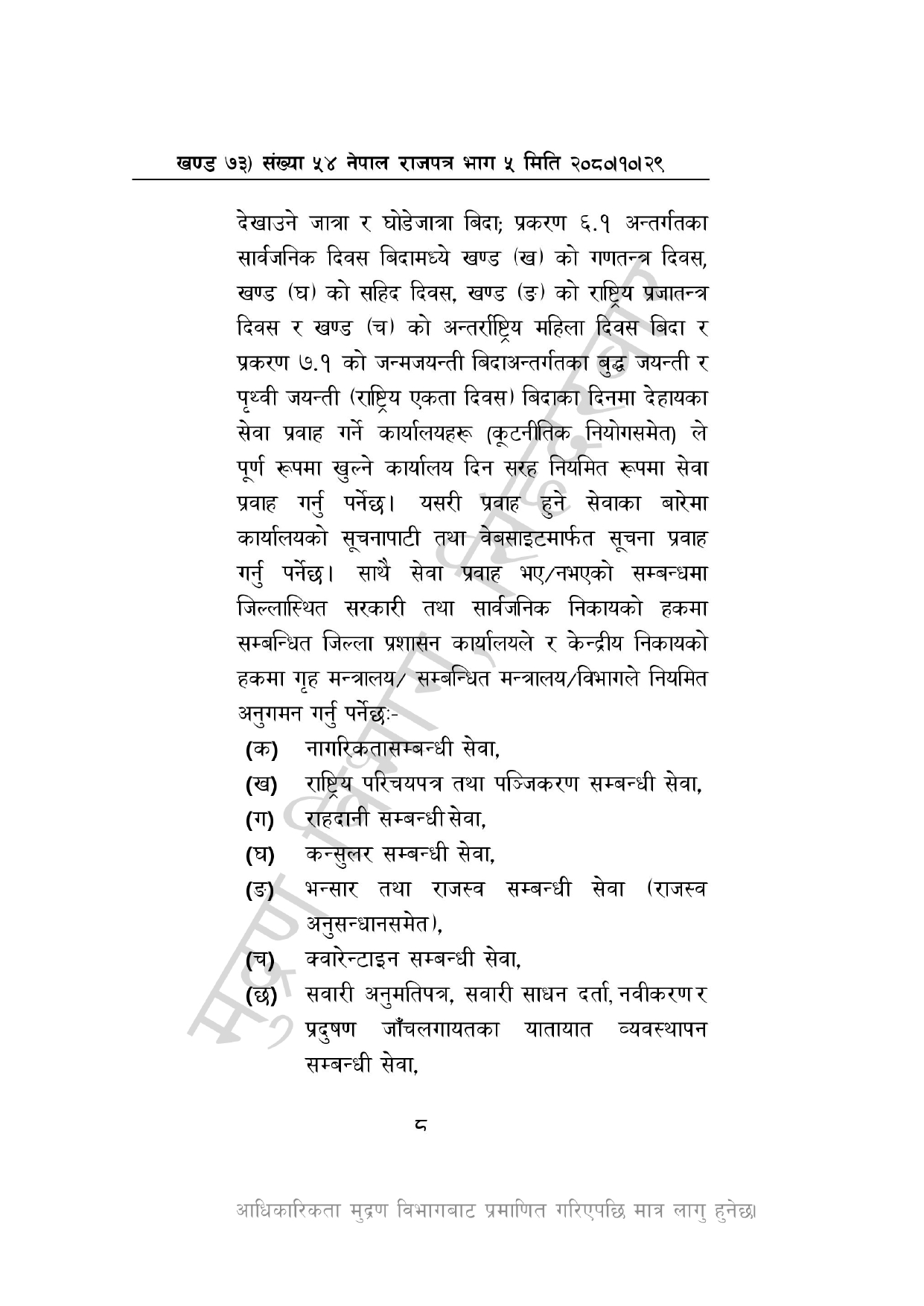 गृह मन्त्रालयले राजपत्रमा प्रकाशन गरेको सूचना अनुसार एक वर्षमा ५३ शनिबार विदा हुने छ भने पर्व, दिवस र उत्सव विदा ३५ दिन कायम गरिएको छ ।