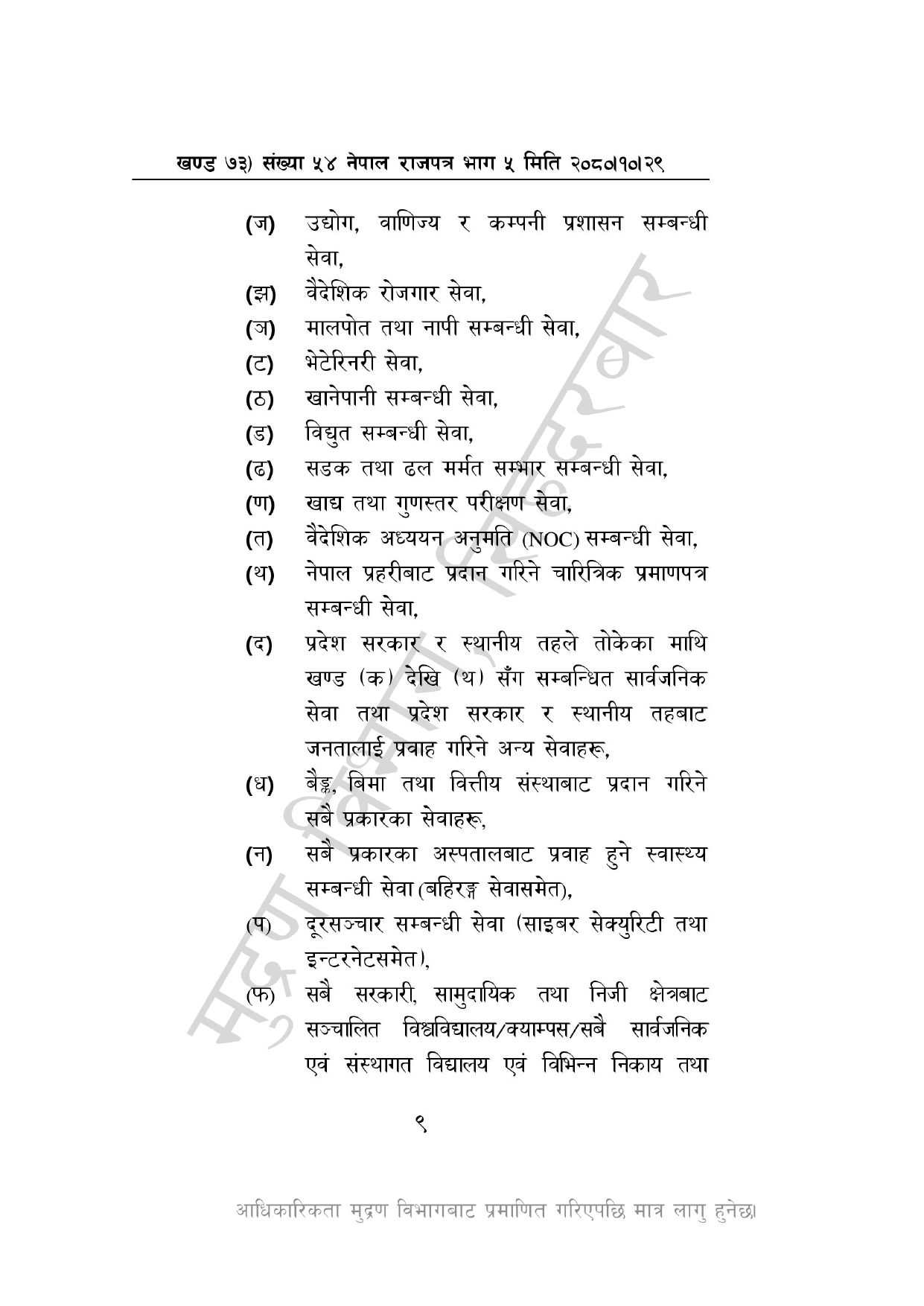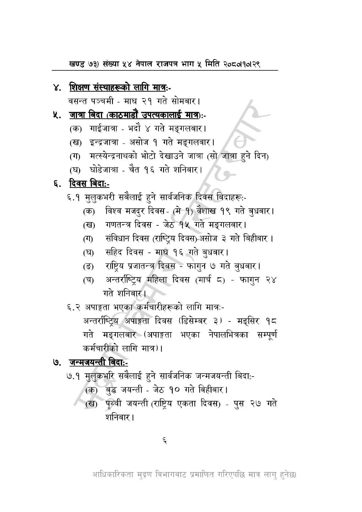 गृह मन्त्रालयले सार्वजनिक गरेको सूचनामा २७ दिन पर्व बिदा छ भने ६ दिन दिवस बिदा र २ वटा जन्मजयन्ती बिदासमेत छन् । चालु वर्षको सुचीमा रहेको जनयुद्ध दिवसको विदा सर्वोच्चको आदेश अनुसार हटाइएको छ भने माघ १६ गते शहिद दिवस र वैशाख ५ गते रामनवमीमा विदा दिनेगरि थप गरिएको छ ।