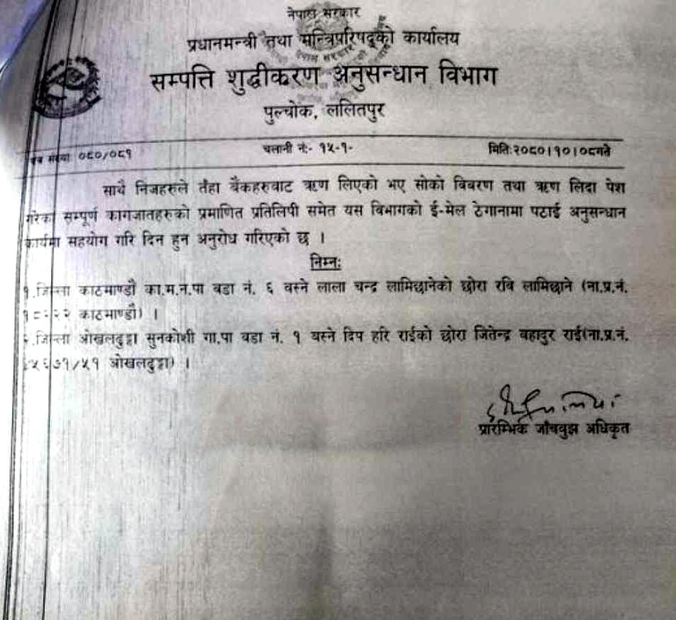 विभागले गत माघ ८ गते नै यस्तो पत्र पठाएको पाइएको छ । पत्रमा लामिछाने र राईको खातासहित कारोबार विवरण उपलब्ध गराइदिन भनेको हो । सम्पत्ति शुद्धिकरण सम्बन्धी कसूर जाँचबुझको सिलसिलामा आवश्यक परेको हुँदा दुबैको नाममा कुनै किसिमको खाता छ वा छैन ? भएमा खाताको प्रकार, कारोबार र अन्य विवरणसहित खाता संचालनका लागि आवश्यक कागजपत्र समेत उपलब्ध विभागले भनेको छ।