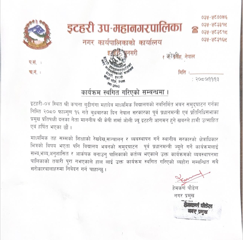 मेयर पौडेलले कार्यपालिकाको निर्णय भन्दै कार्यक्रम स्थगित गर्न पत्र नै पठाएका छन् । भवन निर्माणको काम सम्पन्न नभएको भन्दै उद्घाटन कार्यक्रम स्थगित गर्न उनले सोमबार पत्र पठाएका थिए । तर, व्यवस्थापन समितिका अध्यक्ष डिगबहादुर राईले निर्धारित समयमै भवन उद्घाटन हुने र ओलीले नै गर्ने बताएका छन् ।
