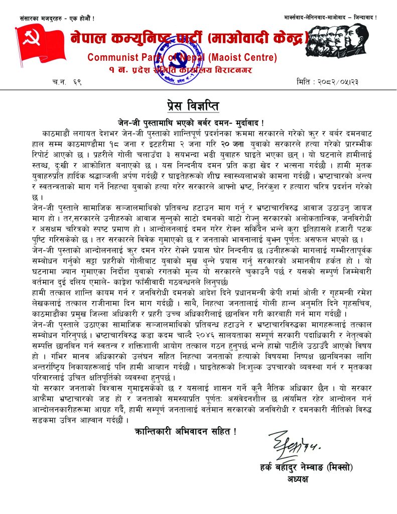 आन्दोलनलाई दमन गरेर रोक्न नसकिने इतिहासमा पुष्टि भइसकेको भन्दै माओवादी केन्द्र कोशीका अध्यक्ष हर्कबहादुर नेम्वाङ मिक्सोले विज्ञप्ति जारी गर्दै सरकारले विवेक गुमाएको र जनताको भावना बुझ्न असफल भएको टिप्पणी गरेको छ ।
