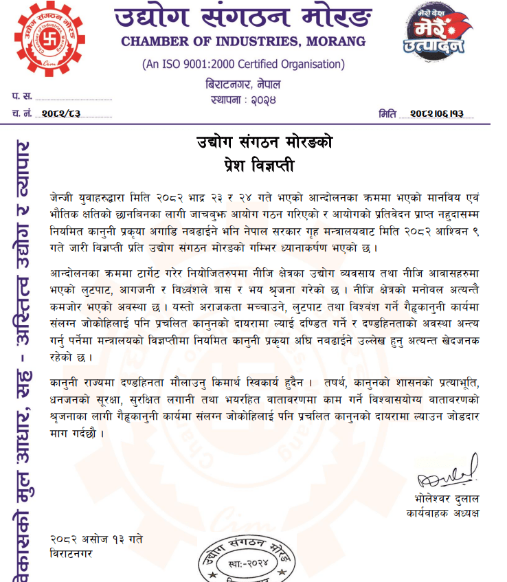 उद्योग संगठन मोरङले २०८२ भदौ २३ र २४ गते भएको आन्दोलनका क्रममा भएको मानवीय एवं भौतिक क्षतिको छानबिनका लागि गठित आयोगको प्रतिवेदन प्राप्त नहुँदासम्म नियमित कानुनी प्रक्रिया अगाडि नबढाउने भनि नेपाल सरकार गृह मन्त्रालयबाट जारी विज्ञप्तिप्रति गम्भीर ध्यानाकर्षण भएको जनाएको हो।
