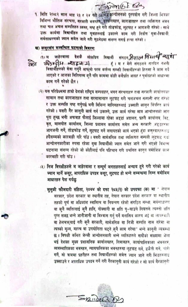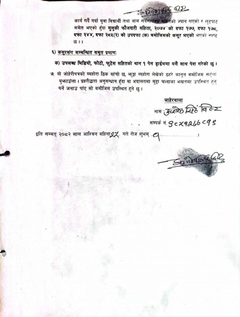 नेपाली कांग्रेस निकट नेपाल विद्यार्थी संघले काठमाडौं र ललितपुर प्रहरी कार्यालयमा आज उनीहरुविरुद्ध जाहेरी दिएको हो ।