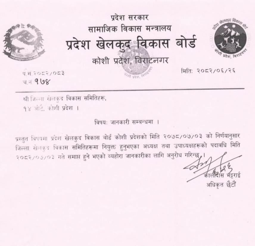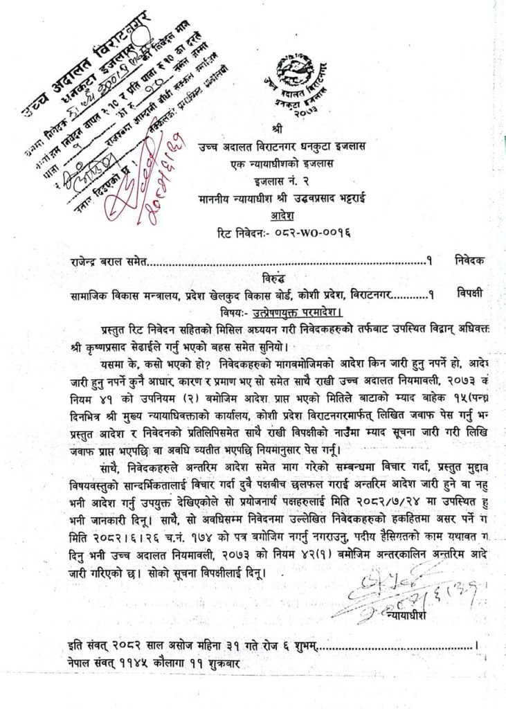 प्रदेशका १४ वटै जिल्ला खेलकुद विकास समितिका अध्यक्ष र उपाध्यक्षहरूको पदावधि सकिएको भन्दै बोर्डले पठाएको गैरकानुनी पत्रलाई तत्काल कार्यान्वयन नगर्न र नगराउन उच्च अदालत विराटनगर, धनकुटा इजलासले अन्तरिम आदेश जारी गरेको हो ।