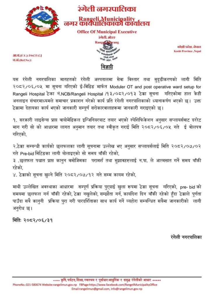 ‘प्री–बिड बैठक, ठेक्का खोल्ने, सम्झौता गर्ने र कार्यादेश दिने जस्ता सबै कार्यहरू बाँकी रहेकाले ठेक्काले पूर्णता पाएको छैन। सबै कानुनी प्रक्रिया पूरा गरी पारदर्शीताका साथ कार्य गरिने व्यहोरा सम्बन्धित सबैमा जानकारीको लागि अनुरोध छ,’ विज्ञप्तिमा उल्लेख छ । पालिकाले रंगेली अस्पतालको महत्त्वपूर्ण स्वास्थ्य पूर्वाधार निर्माणको ठेक्का प्रक्रिया पारदर्शी ढंगले अघि बढिरहेको र कुनै पनि किसिमको अपारदर्शी निर्णय नगरिने प्रमुख अग्रवालले बताए ।