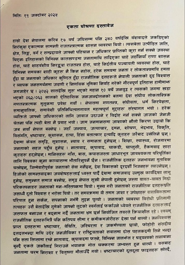 विराटनगर । दक्षिण कोरियामा रहेका दुई प्रमुख वामपन्थी दलका प्रवासी संगठनहरू—नेकपा (माओवादी केन्द्र) निकट ‘नेपाली जनप्रगतिशील मञ्च, दक्षिण कोरिया’ र नेकपा (एकीकृत समाजवादी) निकट ‘प्रवासी नेपाली एकता मञ्च, दक्षिण कोरिया’—बीच हिजो अक्टोबर १९ मा ऐतिहासिक एकता घोषणा भएको छ। यस एकतालाई प्रवासी नेपाली वामपन्थी आन्दोलनमा एक महत्त्वपूर्ण कदमका रूपमा लिइएको छ।