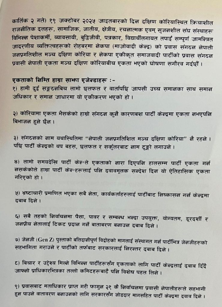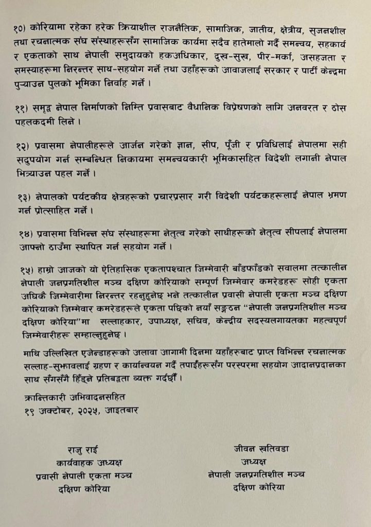 एकता घोषणा गर्दै, दुई संगठनले भविष्यमा आपसी उच्च सम्मान र समान अधिकारका आधारमा अघि बढ्ने, नेपालमा मूल पार्टीहरूबीच एकता नभए पनि दक्षिण कोरियामा यो एकता निरन्तर कायम राख्ने, एकीकृत संगठनको नाम ‘नेपाली जनप्रगतिशील मञ्च, दक्षिण कोरिया’ रहने, भ्रष्टाचार वा अन्य अनियमिततामा संलग्न भई सजायमा परेका सदस्यहरूलाई पदबाट हटाई संगठनलाई शुद्धीकरण गर्ने, निर्वाचन प्रणालीमा योग्य, दूरदर्शी र जनप्रिय व्यक्तिहरूलाई प्राथमिकता दिई नेतृत्वमा ल्याउने वातावरण सिर्जना गर्ने, ‘जेन–जेड’ पुस्ताको भावना र मागलाई सम्बोधन गर्दै उनीहरूको सक्रिय सहभागिता सुनिश्चित गर्ने, भिन्न विचारका अन्य पार्टीहरूसँग समेत सहकार्यका लागि केन्द्रमा पहल गर्ने, र प्रवासमा रहेका नेपालीहरूलाई मताधिकार दिलाउनका लागि सरकारसँग निरन्तर पहल गर्ने जस्ता प्रतिबद्धताहरू जनाएका छन्।