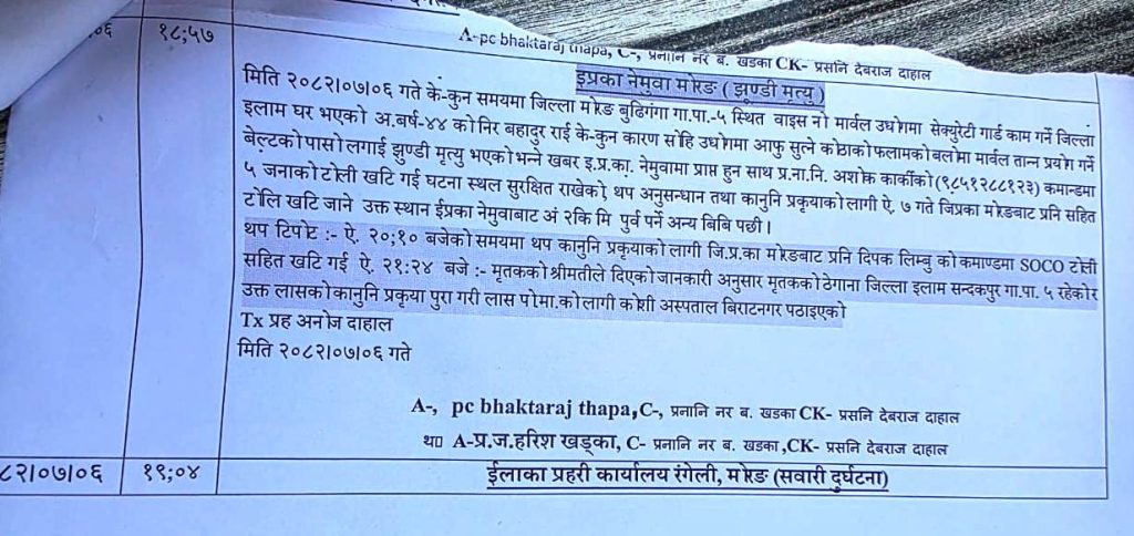 इलामको सन्दकपुर घर भई हाल मोरङको बुढीगंगा–५ स्थित ‘वाइस नो मार्बल उद्योग’मा सेक्युरिटी गार्डको रूपमा कार्यरत ४४ वर्षीय निरबहादुर राई बुधबार मृत अवस्थामा फेला परेका थिए । इलाका प्रहरी कार्यालय नेमुवाको प्रारम्भिक रिपोर्टमा राईले उद्योग परिसरमा फलामको बलाेमा बेल्टको पासो लगाई आत्महत्या गरेको दाबी गरिएको छ ।