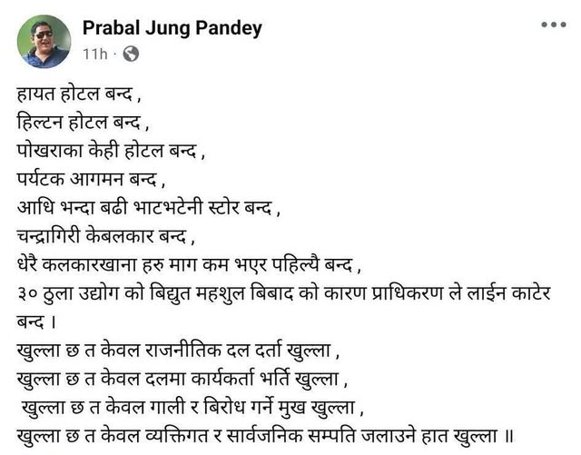 यस आन्दोलनले पर्यटन व्यवसायको मेरुदण्ड मानिने होटल उद्योगलाई नराम्ररी प्रभावित पारेको छ। व्यवसायी प्रबलजंग पाण्डेले पनि आफ्नो फेसबुक स्टाटसमा यस्तै निराशा व्यक्त गरेका छन् । उनले लेखेका छन्, “हायात होटल बन्द, हिल्टन होटल बन्द, पोखराका केही होटल बन्द, पर्यटक आगमन बन्द, आधा भन्दा बढी भाटभटेनी स्टोर बन्द, चन्द्रगिरी केबलकार बन्द।” उनले धेरै कलकारखानाहरू माग कम भएर पहिले नै बन्द भएको र ३० ठूला उद्योगको विद्युत महसुल विवादका कारण प्राधिकरणले लाइन काटेर बन्द गरेको समेत उल्लेख गरेका छन्। पाण्डेको भनाइले देशको समग्र आर्थिक गतिविधिमा आएको सुस्तता र विशेषगरी पर्यटन क्षेत्रमा देखिएको संकटलाई उजागर गरेको छ । जसले नेपालमा लगानीको वातावरण नभएको र लगानीकर्ताहरु पनि निराश भइरहेको सन्देश दिएको छ ।