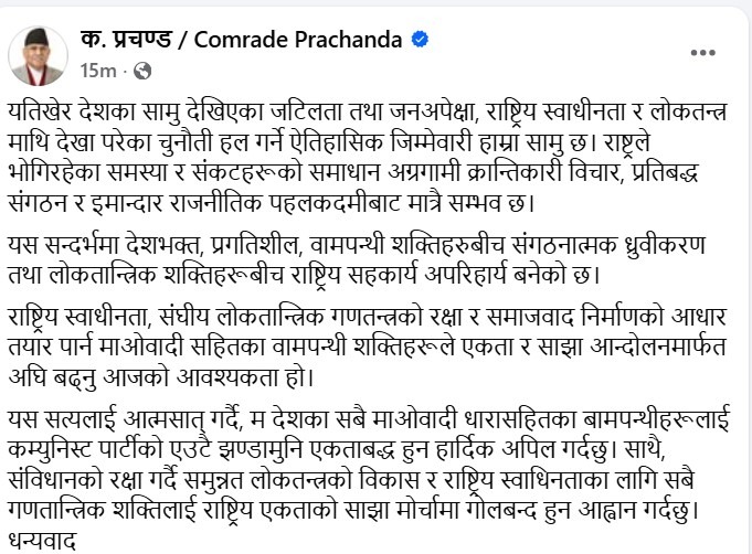 उनले आज बिहान सामाजिक सञ्जाल फेसबुकमार्फत एक सन्देश जारी गर्दै एकताका लागि आह्वान गरेका हुन्। प्रचण्डले राष्ट्रिय स्वाधीनता र लोकतन्त्रमाथि देखिएका चुनौतीहरू समाधान गर्न वामपन्थी एकता अपरिहार्य रहेको बताएका छन्।