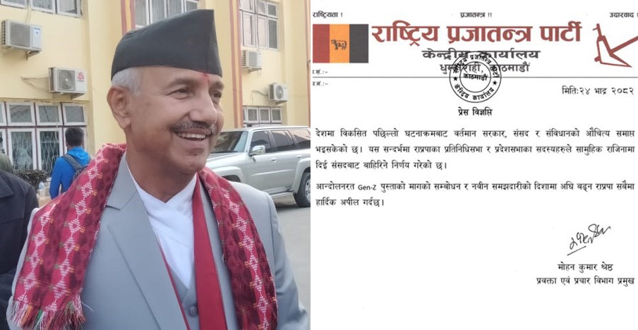 जेनजी विद्रोहका क्रममा तत्कालिन केपी शर्मा ओली नेतृत्वको सरकारले २ दर्जन बढी युवाको ज्यान लिने गरी गोली चलाएपछि राप्रपाले भने २४ गते बैठक बसेर संघीय संसद र प्रदेशसभाका सबै सांसदले राजीनामा दिने घोषणा गरेको थियो । ‘देशमा विकसित पछिल्लो घटनाक्रमबाट वर्तमान सरकार, संसद् र संविधानको औचित्य समाप्त भइसकेको छ । यस सन्दर्भमा राप्रपाका प्रतिनिधिसभा र प्रदेशसभाका सदस्यहरूले सामूहिक राजीनामा दिई संसद्बाट बाहिरिने निर्णय गरेको छ,’ राप्रपाका प्रवक्ता मोहनकुमार श्रेष्ठले जारी गरेको विज्ञप्तिमा उल्लेख थियो ।