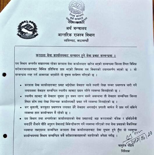 कर भुक्तानी, कर चुक्ता प्रमाणपत्र लगायतका सेवा अनलाइन प्रणालीमार्फत नै प्राप्त गर्न सकिने व्यवस्था रहेको विभागले जनाएको छ ।