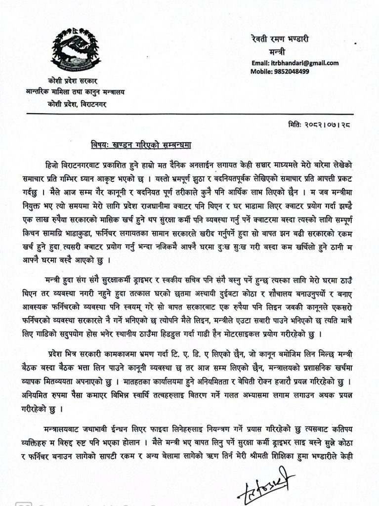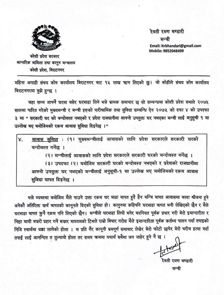 सुनसरीको इहहरीस्थित आफ्नै घरमा बसेर मन्त्री भण्डारीले राज्यकोषबाट मासिक २९ हजार रुपैयाँ घरभाडा बुझ्नै आएको समाचार हाम्रोमले सार्वजनिक गरेको थियो । त्यसपछि उनले शुक्रबार विज्ञप्ति निकालेर समाचार भ्रामक भएको आरोप लगाएका छन् ।