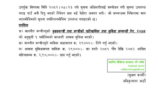 कोशी प्रदेश सभा ऐन २०७५ मा ‘मुख्यमन्त्री तथा मन्त्रीहरूको पारिश्रमिक तथा सुविधा सम्बन्धी ऐन’ अनुसार मन्त्रीहरूले प्रदेश राजधानीमा उपयुक्त सरकारी आवास नपाएमा कानुनले तोकेको आवास सुविधा पाउने व्यवस्था छ । मन्त्रालयका कर्मचारीहरुको अनुसार त्यो आवास सुविधा घरभाडा वापत दिइने सुविधा हो । घरमा बसेवापत दिइने सुविधा हैन ।