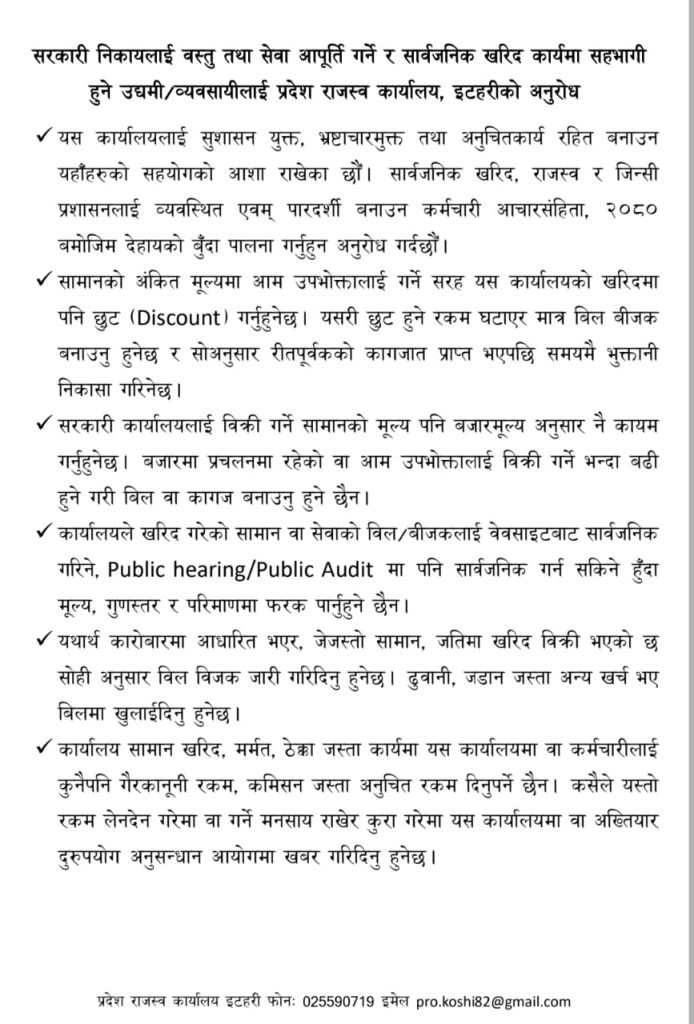 विराटनगर । प्रदेश राजस्व कार्यालय, इटहरीले सार्वजनिक खरिद प्रक्रियालाई पारदर्शी, मितव्ययी र भ्रष्टाचारमुक्त बनाउन पहल थालेको छ। कार्यालयले एक सार्वजनिक सूचना जारी गर्दै सरकारी खरिदमा सहभागी हुने उद्यमी तथा व्यवसायीहरूलाई सुशासन कायम गर्न सघाउन अनुरोध गरेको छ।