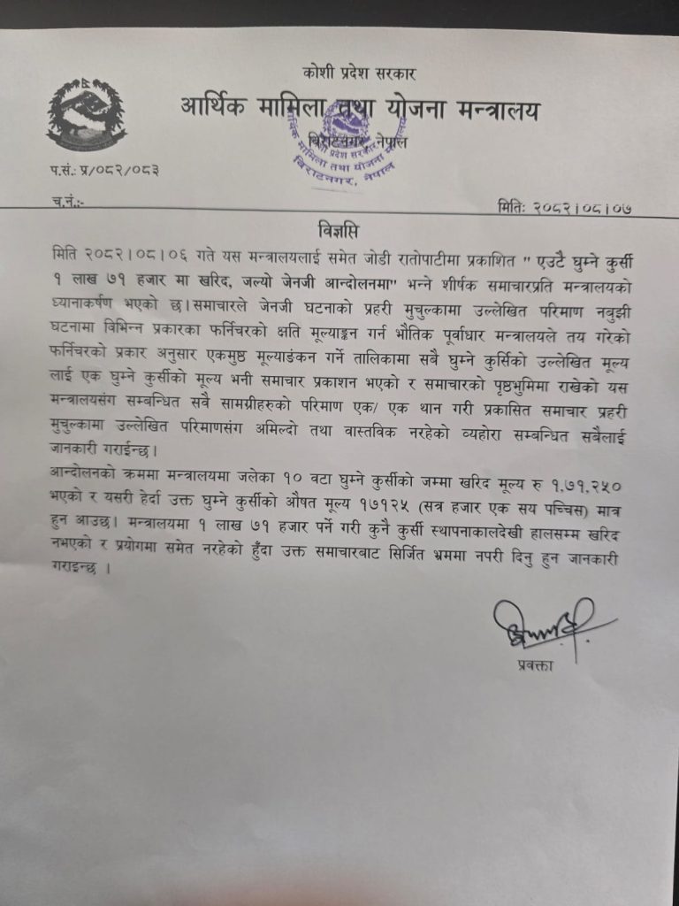 समाचारमा ‘एउटै घुम्ने कुर्सी १ लाख ७१ हजारमा खरिद, जल्यो जेनजी आन्दोलनमा भन्ने शीर्षकमा समाचार प्रकाशित भएको थियो । मन्त्रालयका प्रवक्ता सुशील बाँस्तोलाद्वारा जारी विज्ञप्तिमा भनिएको छ, ‘समाचारले जेनजी घटनाको प्रहरी मुचुल्कामा उल्लेखित परिमाण नबुझी घटनामा क्षति भएका फर्निचरको प्रकार अनुसार एकमुष्ट मूल्याङ्कन गर्ने तालिकामा सबै घुम्ने कुर्सीको उल्लेखित मूल्यलाई एक घुम्ने कुर्सीको मूल्य भनी समाचार प्रकाशन भएको देखिन्छ ।’