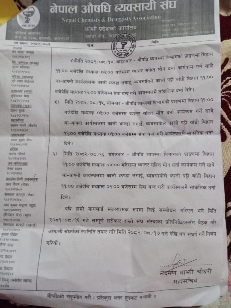 औषधि ऐन २०३५ को संशोधनमा राखिएका ‘अव्यावहारिक, अन्यायपूर्ण र व्यवसायीलाई विस्थापित गर्ने’ प्रावधान तत्काल खारेजीको माग गर्दै नेपाल औषधि व्यवसायी संघ, कोशी प्रदेशले कडा आन्दोलनको घोषणा गरेको हो ।