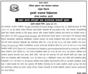 विगराटनगर । हुलाकी राजमार्गअन्तर्गत झापा र गौरीगञ्ज जोड्ने कन्काई नदीको पुल १४ वर्ष बित्दासमेत निर्माण सम्पन्न नभएपछि अन्ततः ठेक्का तोडिएको छ । सडक विभाग अन्तर्गतको योजना कार्यालय इटहरीले बिहीबार सूचना जारी गर्दै निर्माण कम्पनी ‘पप्पु महादेव खिम्ती जेभी’ सँगको ठेक्का सम्झौता अन्त्य गरेको हो ।